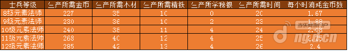 元素法师生产所需资源、时间及每小时消耗金币数:
