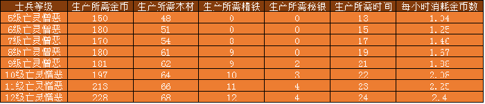 憎恶生产所需资源、时间及每小时消耗金币数: