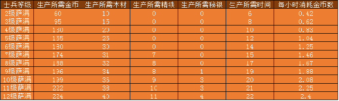 萨满生产所需资源、时间及每小时消耗金币数: