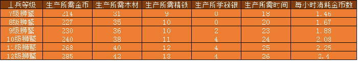 狮鹫生产所需资源、时间及每小时消耗金币数: