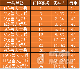 兽人步兵各等级战斗力与负重: