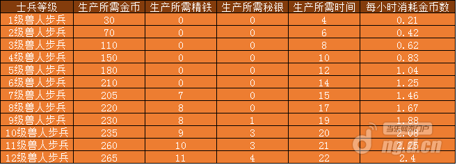 兽人步兵生产所需资源、时间及每小时消耗金币数: