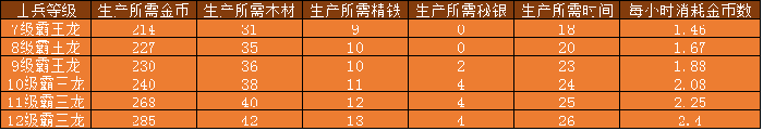 霸王龙生产所需资源、时间及每小时消耗金币数: