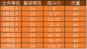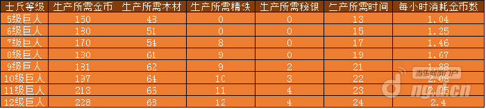 人类巨人生产所需资源、时间及每小时消耗金币数: