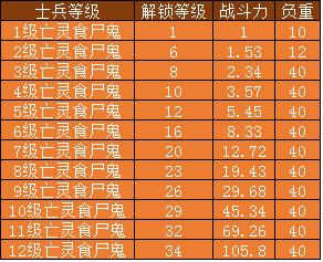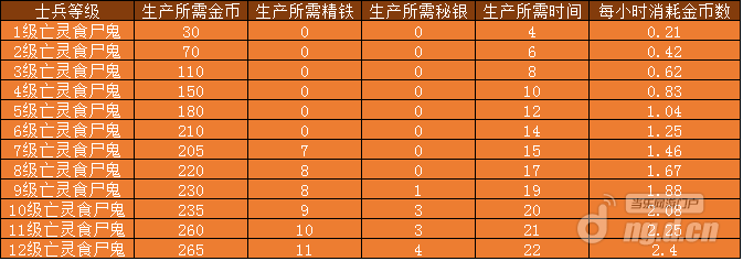 亡灵食尸鬼生产所需资源、时间及每小时消耗金币数:
