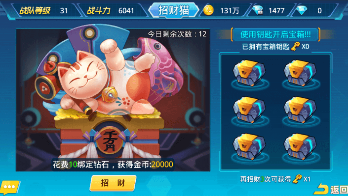 当玩家招财达到一定次数,还可以额外获得宝箱钥匙。