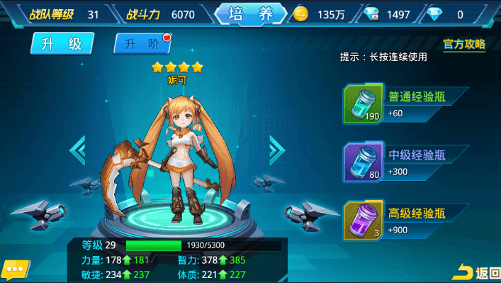 少女可以通过吞噬经验瓶、在副本中上阵战斗两种方式提升等级。
