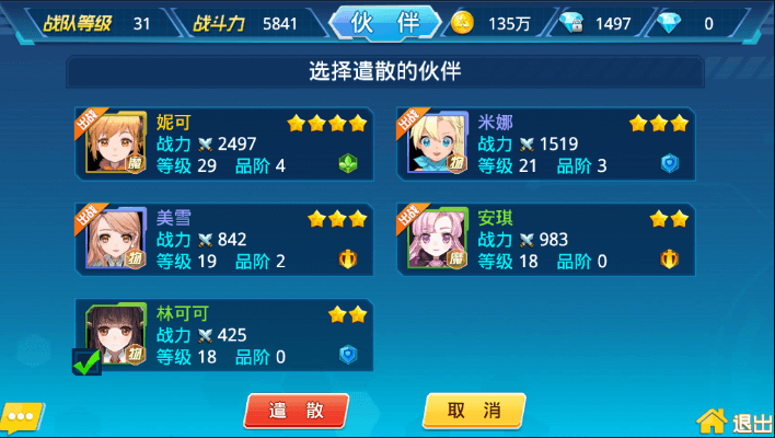 少女可以遣散,遣散后少女将消失。遣散后将根据少女的等级品阶给予一定比例的招募资源、升级经验、升阶卡返还。