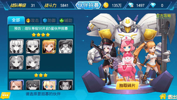 玩家可以通过招募系统获得上阵战斗的少女伙伴,根据队伍的等级,玩家可以招募不同星级的少女伙伴。星级越高的少女四围属性越高,成长性越强,所拥有的技能越强大。