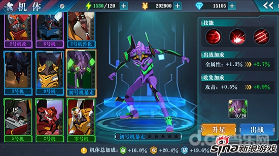 初号机的收集加成可增强机体生命力,收集一定数量的初号机碎片即可为机体升星,叠加生命加成。因此,在游戏中有针对性的收集初号机碎片,可以缔造更为顽强的生命力。炮火连天的对战中,初号机的紫色装甲永远是最坚实的后盾!