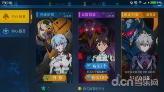 《新世纪福音战士:破晓》中的招募系统为玩家提供了招募到适格者、EVA机甲的机会。招募系统分为普通招募、高级招募、限定招募和特权招募,其中限定招募和特权招募有几率获得神化EVA机体;普通招募和高级招募每隔一段时间会有一次免费机会。