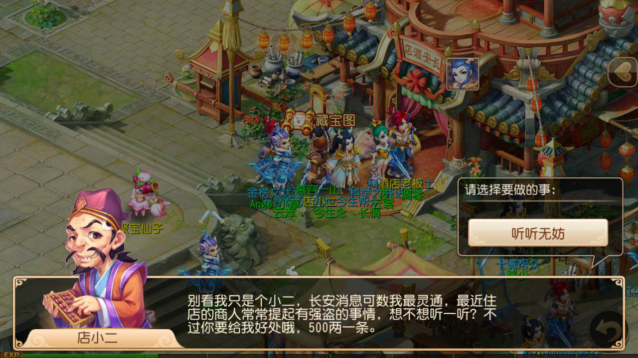 【领取宝图任务】当玩家在游戏中角色等级提升到25级以上,就可以点开活动界面参与“宝图任务”了。玩家可以点击参加按钮自动寻路到任务NPC处领取宝图任务,也可以自行到长安城酒店门口的店小二处领取任务,每次领取任务需花费500银币。