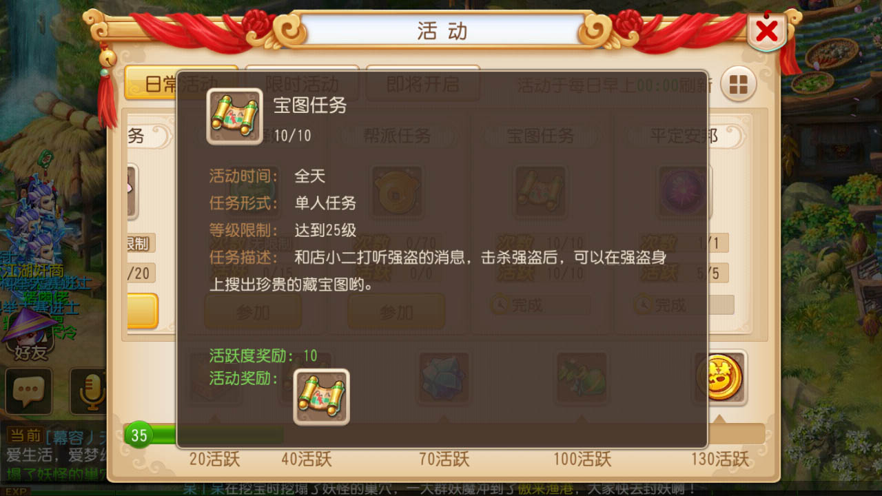 【次数限制】手游中不能像端游那样无限打宝图,每天只能接取10次宝图任务,每次完成宝图任务可以增加1点活跃度,每天可以通过宝图任务获得10点活跃度,活跃度积累到一定额度可以领取相应的活跃度奖励。