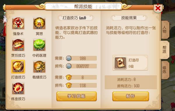 【打造、裁缝、炼金】:可以制造与自己帮派技能等级相符的打造符、裁缝符、炼金符的技能,这些符可以用于打造、炼金、裁缝以及其修理上。虽然底价不低,但市场需求不大,如果玩家不能保证自身等级能够始终处于服务器前列,使自己有更高级的打造类技能,那么通过这一模式盈利,速度相对会比较缓慢。但由于目前修理装备的途径有限,在修炼好其他技能后,可以考虑学习一定的打造类技能。