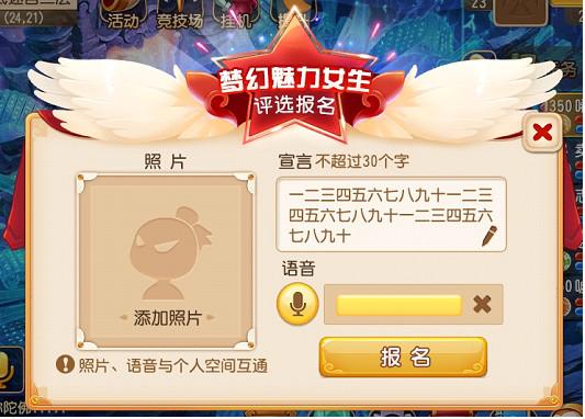 在报名界面上,玩家可以添加照片(照片与游戏个人空间互通)、填写参与活动宣言和添加个性展示语音,完成报名信息录入后点击“报名”按钮即完成活动报名。