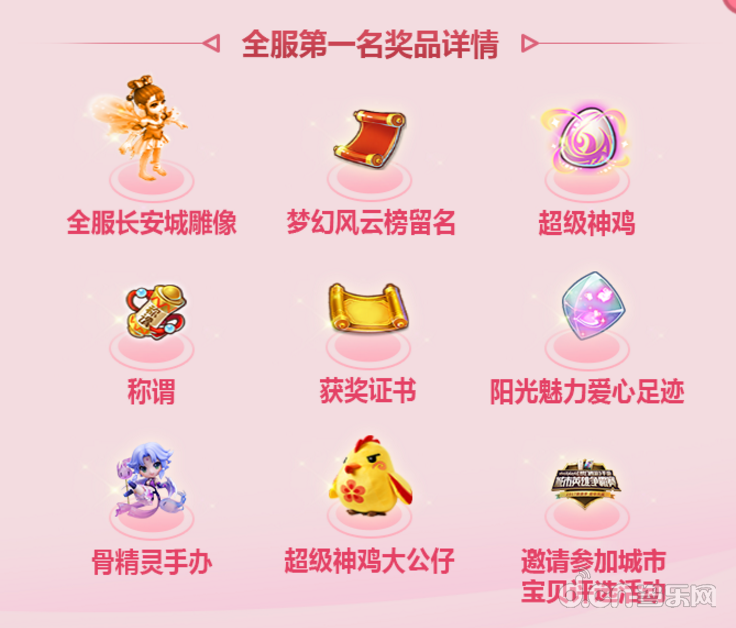 为了让参选玩家能够乘兴而来,满载而归,本届阳光魅力榜也提供了丰厚的个性化奖励相赠。本服评选阶段,不仅有活动专属称谓、聊天频道专属图标及头像特权、阳光魅力感恩礼、专属空间秀等,获得各组第一名的玩家,还将拥有本服长安城专属雕像特权;而在全服评选阶段,除了全服长安城专属雕像特权等之外,更有超级神鸡、专属爱心足迹、全新骨精灵手办和超级神鸡大公仔等你来拿。此外,各组的全服前5名还将有机会参加2017城市英雄争霸赛线下总决赛,为角逐梦幻城市宝贝和梦幻活力城市等殊荣而战!