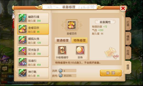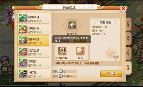 普通修理虽然廉价,但是有一定的失败风险,对于一些高价极品装备而言,很多人不愿意冒装备损坏的风险,这时候你就需要特殊修理了。你只要花费10仙玉,就能购买一个珍珠,再加上相应的制造符即可完成特殊修理。看起来似乎有点坑?其实并非如此。笔者给你算一笔帐:50级装备修理需要花费13万银两,100仙玉可以兑换100万银两,也就是说10仙玉=10万银两,你花费10万银两,100%修理成功,为装备补充100耐久,何乐而不为呢?虽然装备耐久度上限不止100点,但对于极品装备而言,特殊修理依旧是最佳选择。