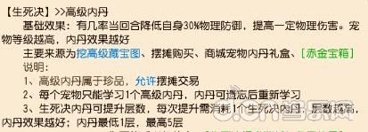 生死决:有几率当回合降低自身30%物理防御,提高一定物理伤害。宠物等级越高,内丹效果越好。舍身击:增加物理攻击的伤害结果,提升效果与力量点数有关。宠物等级越高,内丹效果越好。对比分析:生死决效果:一层效果,10%几率当回合降低自身30%物理防御,提高15%物理伤害。根据测试,使用鬼子为1500攻资,成长1.226,79级宠物生死决一层效果伤害为79.2,90级宠物生死决一层效果伤害为90。生死决满层(五层)效果为降低自身 30%物理防御提高30%物理伤害。攻宠第一内丹,因为提升的攻击随时有效。