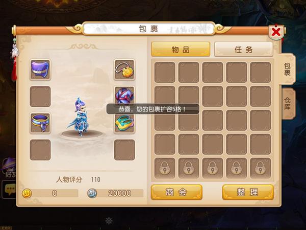 物品越来越多放不下了怎么办?打开道具栏,选择包裹,点击包裹里的锁即可扩展你的随身包裹了。