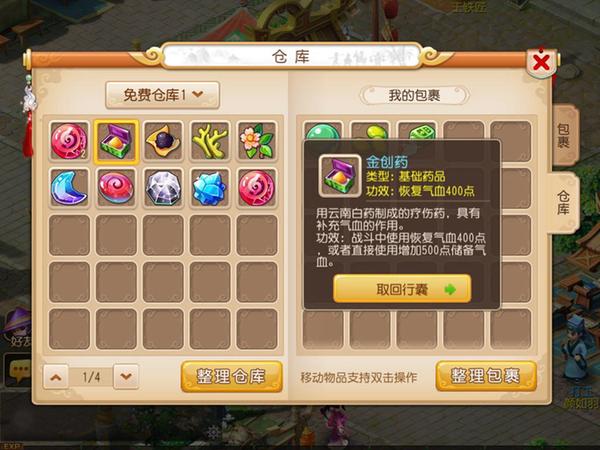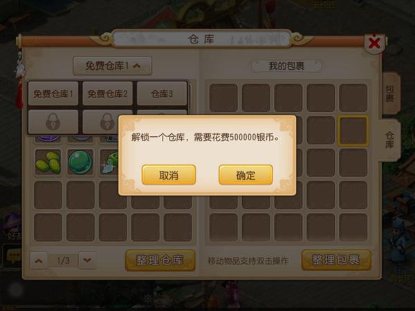 如果有一些暂时不使用的道具,就可以先寄存到仓库中储藏,初始有两个免费仓库,每个仓库共25个物品格。
