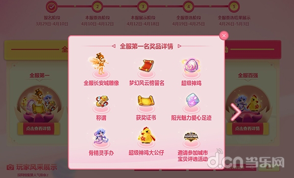 而在全服评选阶段获得自己组别第一名的玩家,将获得特殊称谓、全服长安城雕像特权、神兽超级神鸡、阳光魅力专属爱心足迹、全新骨精灵手办、超级神鸡大公仔等奖励,并进驻梦幻风云榜。