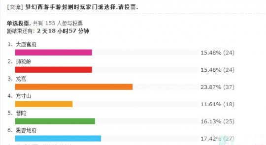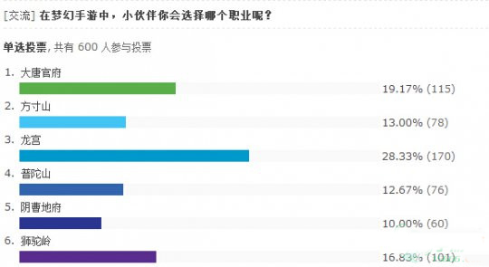 一路高歌。从投票结果可以看出,法系界大哥龙宫(占23.87%)依旧一路高歌,稳握第一席位,法术远程攻击果真不是吃素的。