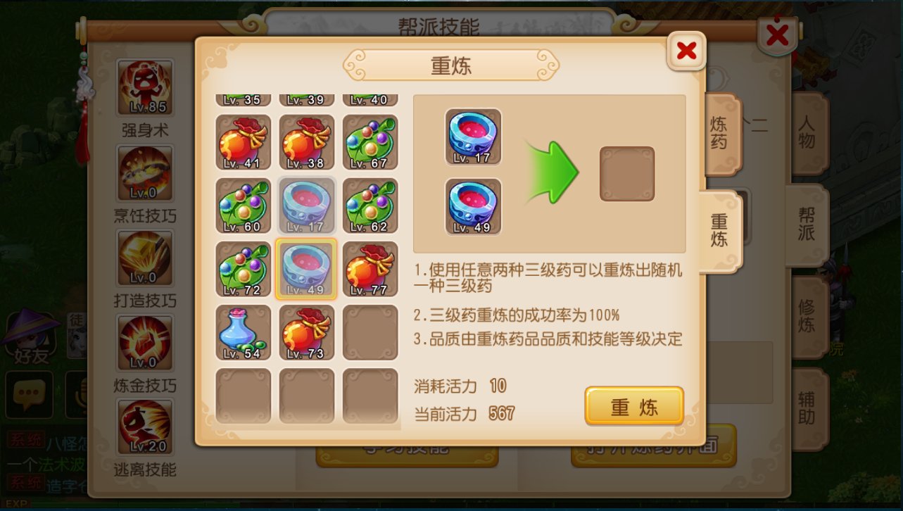 二:重炼药品的品质取决于两个因素,一个是你的原料药品自身的品质。另外一个则是你自己中药医理的等级。也就是说,原料药品的品质如果不高,你炼出来的药品品质也不会高,原料药品即便是高品质,你的中药医理技能不高也没什么用。也就是说,想要将只卖100金的定神香变成能卖1000多金的金香玉,你首先自己技能就要高。而且做了出来也不能变成钱,只是能帮你省下一点钱而已。所以重炼系统其实真正的受益者,只有学了高级中药医理的玩家。