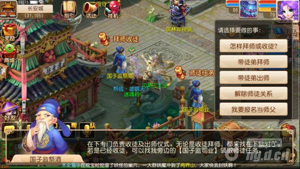 玩家只要等级≥65级,即可成为20≤等级≤50没有拜师的玩家的师父,两人可以去国子监祭酒处建立师徒关系。需要注意的是:如果师父主动解除师徒关系72小时内师父不能收徒弟。如果徒弟主动解除师徒关系,12小时内徒弟不能再拜师,而且一天之内一个师父最多只能拥有2次师徒关系。也就是说,即便是徒弟主动解除师徒关系,师父也只能在这一天再找另外一个人做徒弟。另外,每个师父最多同时只能收1个徒弟。