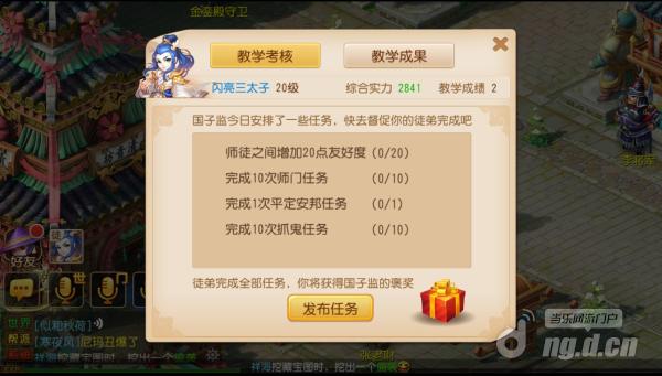 教学考核:国子监每天发布的一些任务,师父每天要消耗100活力来将这些任务发布给徒弟,徒弟完成之后,两人就能获得今天的师徒奖励。(笔者完成一轮教学考核任务,能领取79000经验和12900钱,目前看来应该和师父自身等级有关)。