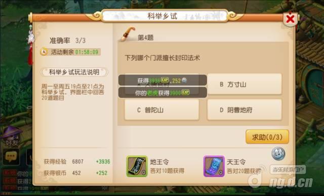 除了天王令和地王令之外,科举大赛还有一个求助系统,就是在答题过程中,玩家有3次场外求助机会,可以将问题发到自己的帮派中去。但是就目前的体验来看,求助系统形同虚设,原因就是在活动时,活动页面会遮挡住玩家聊天框,很多玩家为了争分夺秒而不会离开活动页面等待其他玩家解答。因此在科举大赛中,求人永远不如求己。