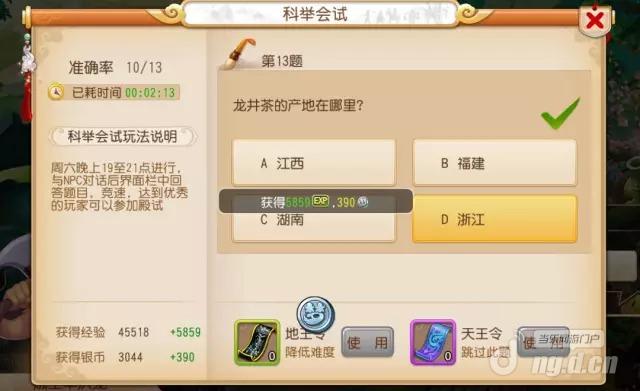 在《梦幻西游》手游的科举大赛活动中,总共分为三大阶段,分别是乡试、会试和殿试。其中乡试即便你的成绩一塌糊涂,甚至不参加,你也能够获得会试资格。但是这并不意味着乡试不重要了,在乡试中,你可以获得珍贵的科举大赛道具,用于会试之中。当你答对10题时可获得地王令,20题时可获得天王令(玩家不需要连续答对这些数量的题目)。也就是说,如果你每天参加乡试,并且保证100%的正确率,到会试当天你能获得10个地王令和5个天王令。