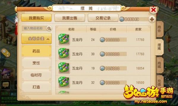 任务2:药品收购,根据任务购买所需的二级药或三级药,二级药在长安城药店即可,三级药可以自身进行合成或在商会摆摊中购买;(以三级药五龙丹商店购买为例)