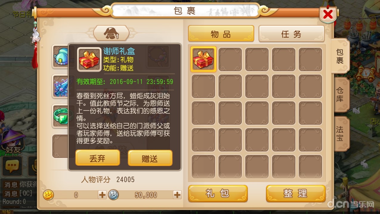 对于无数学子来说,在教师节为自己的恩师送上一份诚挚的祝福,是他们表达谢意的最好方式。在9月9日~9月11日期间,每天等级≥40级的玩家可以找到NPC太学博士领取一份谢师礼盒,只要将礼盒送给自己的门派师父或者玩家师父,就能够获得一份丰厚奖励。需要注意的是,如果玩家将礼物送给玩家师父,不仅玩家本身能够获得丰厚奖励,而且师父也能在打开谢师礼时,获得一定的奖励哦!所以在获得礼盒之后,不妨将其优先转赠自己的玩家师父,让他开启节日惊喜吧!