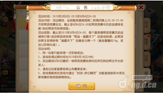为了庆祝帮战的全面开启,从5月6日~6月4日,在活动期间每个服务器帮派竞赛离世成绩排名第一名的帮派将获得“帮战?雄霸天下”的绝版游戏称号,同时此帮派帮主将获得标有“雄霸天下”的10克黄金令牌一个!为你铭记你与自己的帮众众志成城勇攀巅峰的每一刻。