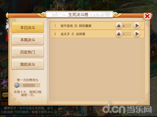 玩家可以在御林军统领处查看生死决斗榜,决斗榜包含“本日决斗”、“本周决斗”、“历史热门”、“我的决斗”,玩家可以查看决斗录像,对自己喜欢的决斗点赞。