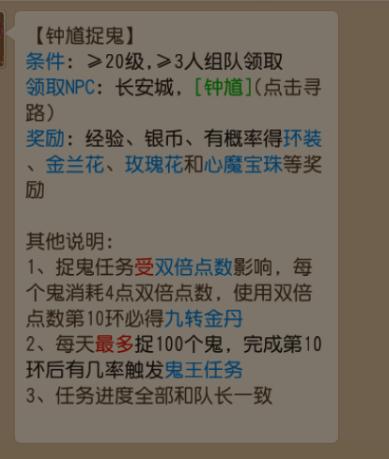 另外,领取一次捉鬼任务可以捉10个鬼,每天每个玩家只能最多完成100个捉鬼任务(也就是消耗400点双倍点数)。