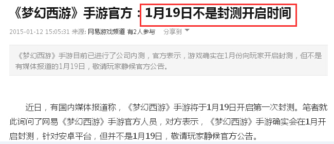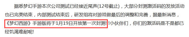 上周小编得到消息,据官方透露梦幻西游手游暂定1月19号封测,网上也有众多1月19号封测的消息,但是今天下午看到了官方澄清梦幻西游手游并不在1月19号进行首测的消息。