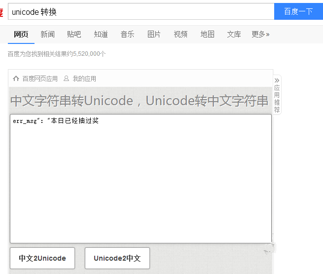 7:在右边两个红框中会显示抽奖结果:"history": [0, 1] 这样就是抽中过了,其他的就是没有抽中,"err_msg": "\u672c\u65e5\u5df2\u7ecf\u62bd\u8fc7\u5956" 这个内容是unicode编码的返回值,到百度里转换一下看看。