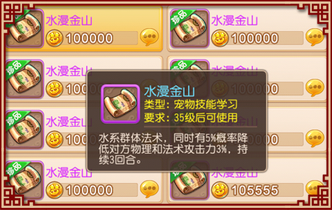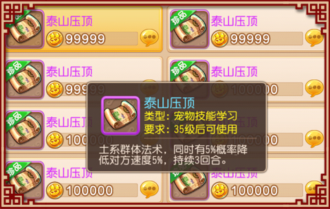 5%的几率降低对方速度5%,持续3回合。端游里抢速度优势,要么流云、凝滞,要么地府爪子抓,这样都会浪费人物的行动。现在手游里加属性的系统没有端游里那么多,所以5%的速度很可能成为抢一速的关键。有了带泰山的法宠,抢速度优势就容易多了。