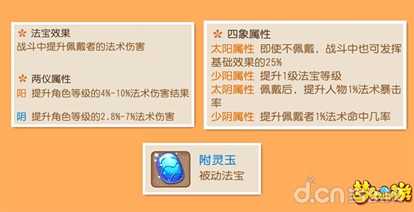 附灵玉:战斗中提升佩戴者的法术伤害。四象属性一般是选择少阳,提升1级法宝等级就相当于直接提升伤害。土豪会选择太阴,提升1%的法术暴击率。