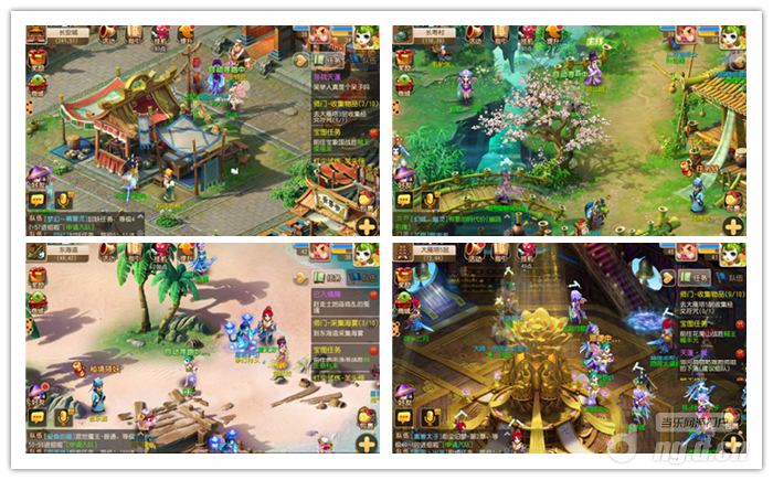 这次的《梦幻西游》依然沿袭了端游的Q版,色彩艳丽,饱和度高。小编曾经慕名搜过端游的相关图片,然后就是看见遍地的萝卜丁,当然那时候Q版还不是如今这么流行,再说端游采用Q版给小编的第一感觉就是这是小盆友玩的。游戏的场景丰富,每个场景都有其独特的画风,据说所有场景都由美工手绘完成,突然觉得诚意满满啊。这么多的地图不会让玩家容易产生视觉疲劳,有一种探索下一个地图就有新的惊喜的感觉。