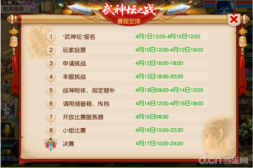 在投票阶段结束之后,接下来票选第一的团队就将与上届擂台争霸赛第一名团队进行对战,争夺武神坛的出战权!只有在对战之中获得胜利的团队,才能最终赢得参赛权。而胜出的团队将在武神坛上,将会经历积分赛、淘汰赛等一系列考验,在4月17日最终代表所有服务器玩家挑战上古邪神蚩尤!在这一史诗之战中,让我们共同见证新的PK英雄的诞生!
