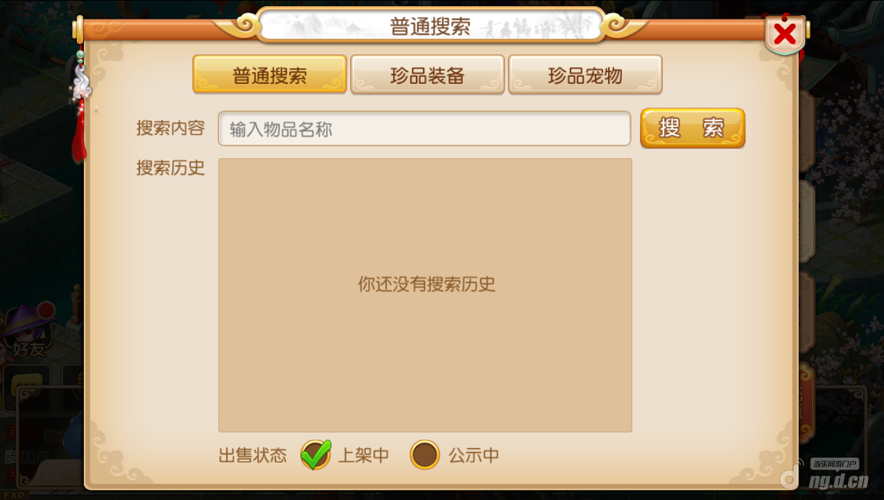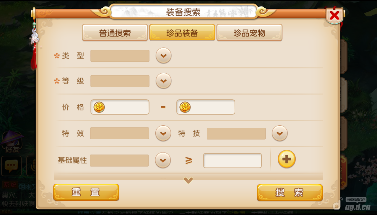 智能搜索系统,实际上就是珍品装备和珍品宠物的搜索系统,在整个系统中的“普通搜索”功能其实就是改版前的搜索功能。玩家如果想要搜索各种珍品,则可以选择“珍品装备”和“珍品宠物”两个按钮。