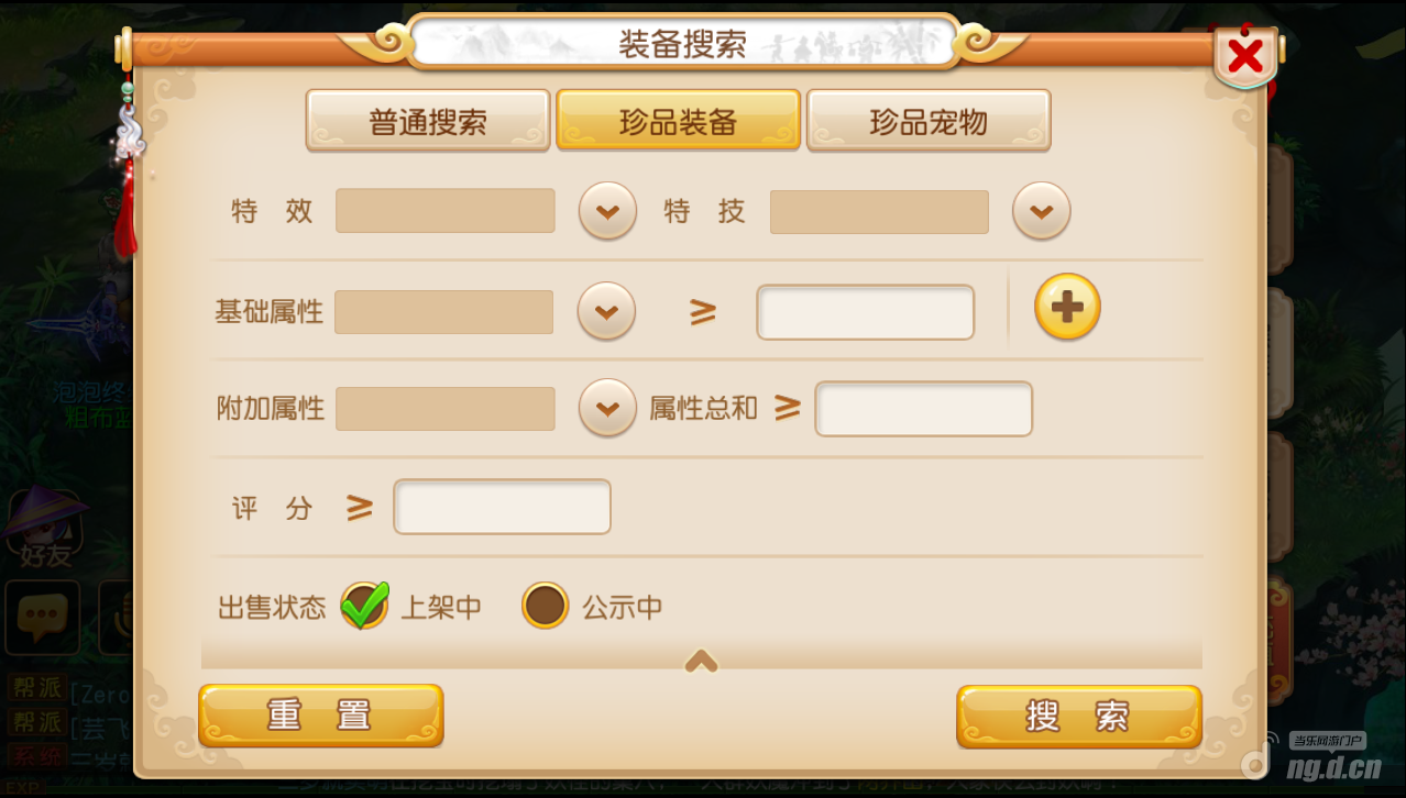 珍品装备搜索栏内,你必须要填的内容是装备类型(也就是部位)以及相关等级,在此之后,你可以选填价格区域、特效、特技、基础属性、附加属性、属性总和、评分,并在上架中和公示中二选一。几乎涵盖了珍品装备搜索中你都能想到的装备要点。