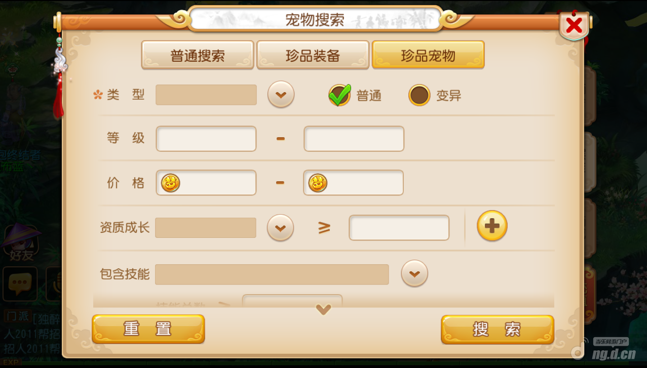 和珍品装备搜索略有不同,珍品宠物搜索最重要的实际上就是包含技能以及技能总数两个要点上,前者决定了宠物自身是法宠、血宠还是攻宠,而后者则决定了这只宠物未来的成长空间。所以除了必填项,笔者建议你也将这两项填进去,再决定是否要填其他项目。