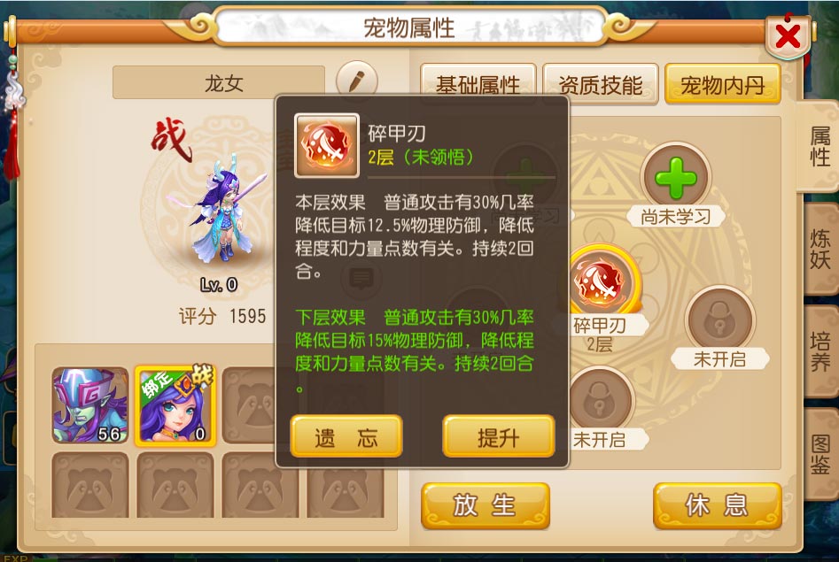 宠物可以遗忘已经学习的内丹。遗忘后该内丹属性消失,并根据遗忘的内丹层数返还一部分同种内丹道具。