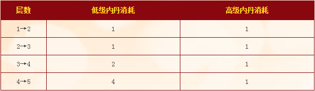 内丹学习后为1层,可以通过消耗同种内丹进行提升,最多可以提升到5层。