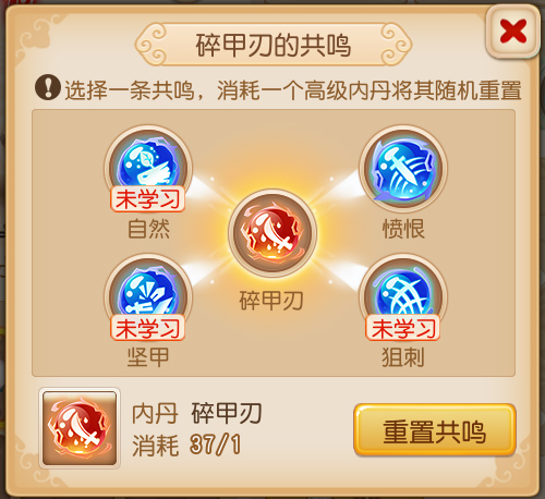 高级内丹最多拥有4条共鸣。共鸣条数不满4条时,可以消耗1个同种高级内丹增加1条共鸣。