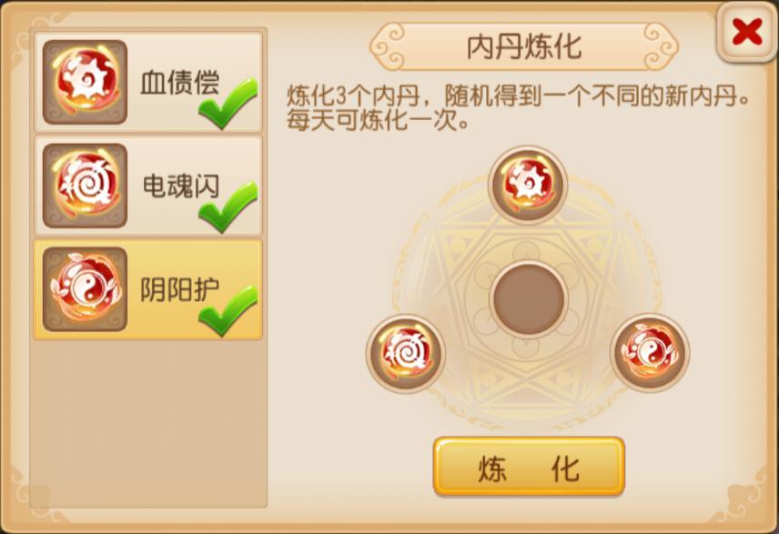 1、3个低级内丹一定会炼化出1个低级内丹,3个高级内丹一定会炼化出1个高级内丹。也可以搭配高、低级内丹进行炼化,则有可能得到高级内丹或者低级内丹。