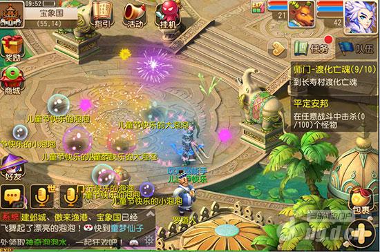 儿童节的意义,在于提醒每一个人成长的意义。但是在《梦幻西游》手游的世界里,所有的玩家都可以在梦幻欢乐的乐园中感受到儿童节特别活动的童真与乐趣。在这个有爱的节日里,《梦幻西游》手游官方非常贴心地为玩家们安排了六一四天乐!从5月31日到6月3日,只要玩家等级≥40级,就可以到建邺城、傲来渔港、宝象国找NPC童梦仙子领取儿童节活动专用道具“神奇泡泡水”,在中午12:00-13:00,晚上18:00-19:00,22:00-23:00,这三个时间段,小伙伴们可以尽情的穿梭在《梦幻西游》手游的童年时光中,撒着欢的吹泡泡或者踩泡泡,这可是每一个孩子都喜欢做的事情。